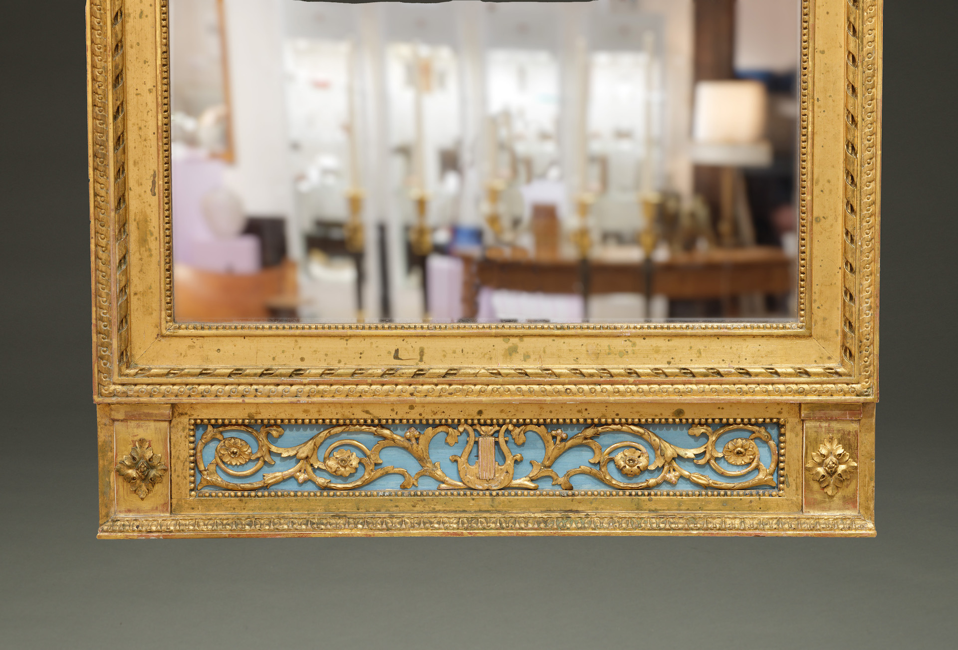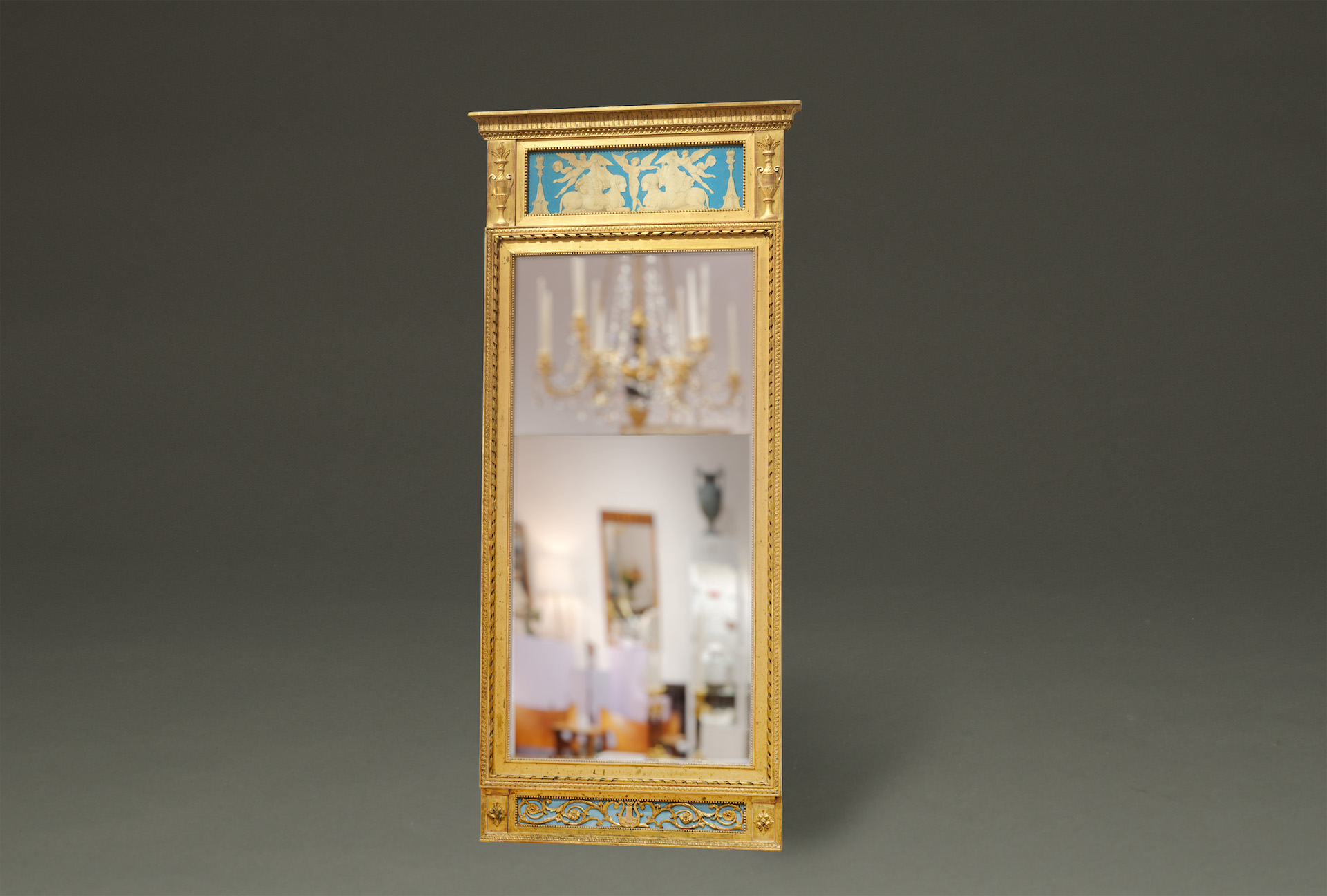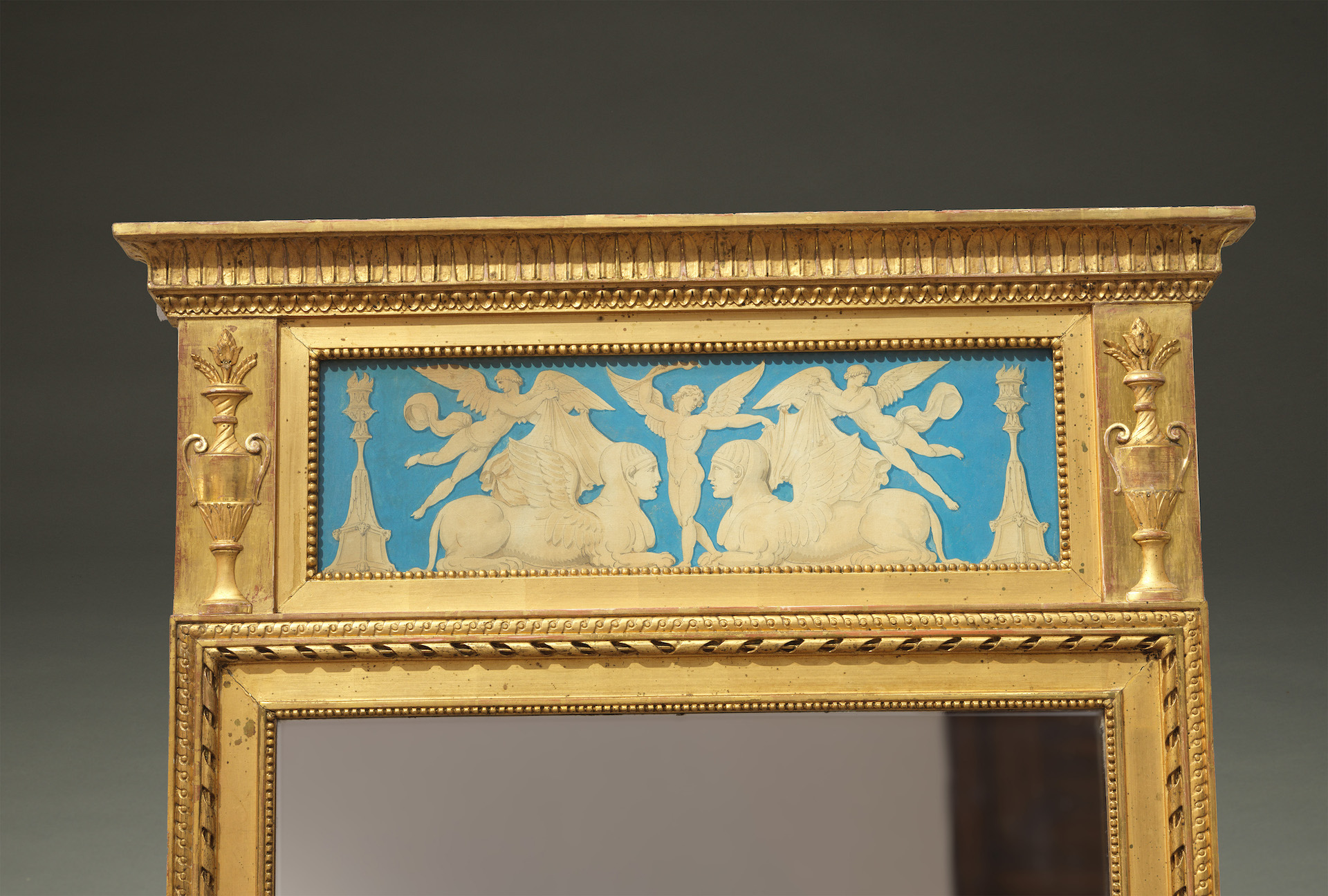 The mirror is richly decorated with carved and gilded ornamentation, executed in both matte and burnished finishes. The decoration includes classical motifs such as ribbon moulding, beading, and fleurons. At the crest is an Egyptian-style figural composition in pen and watercolour, attributed to Louis Masreliez.