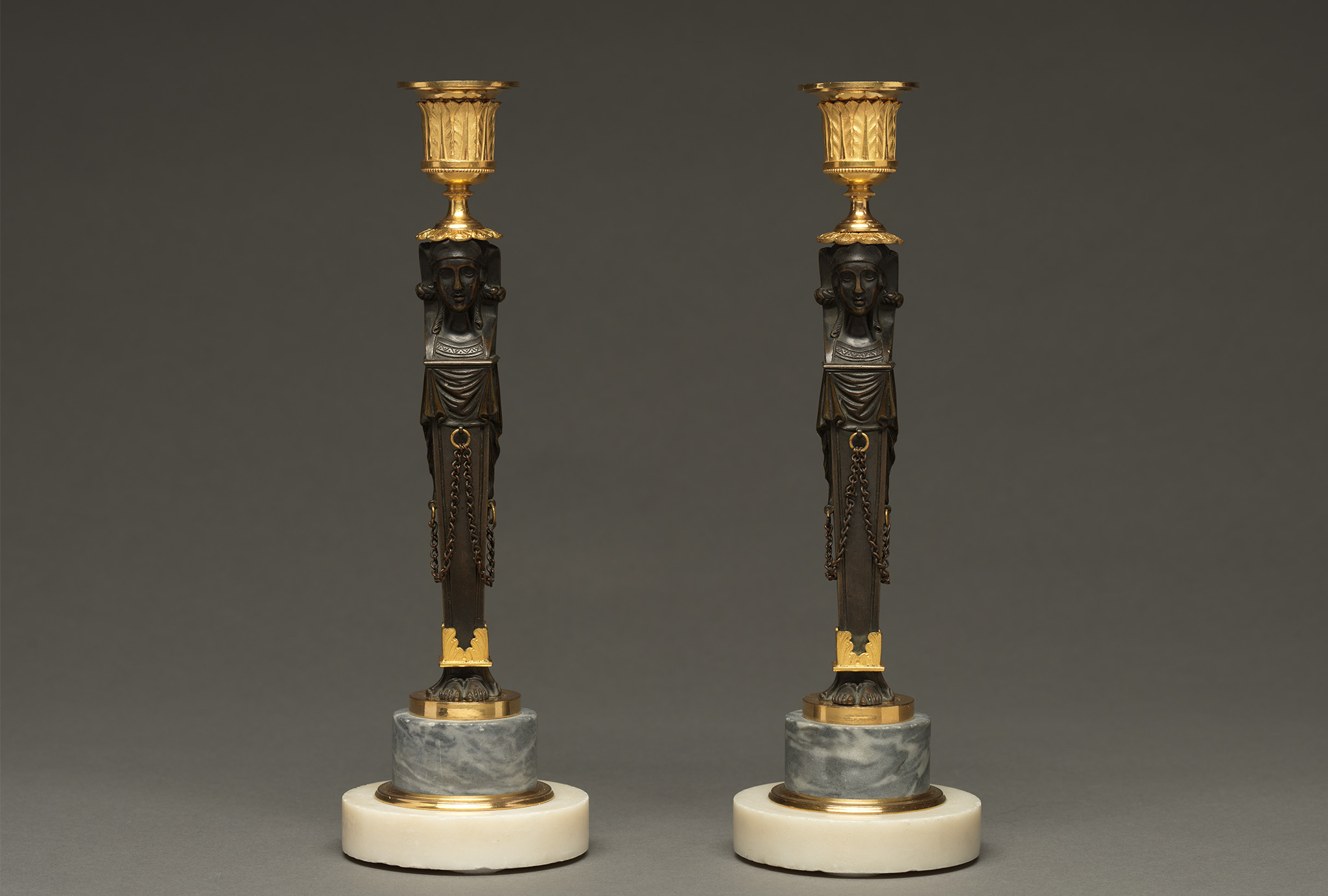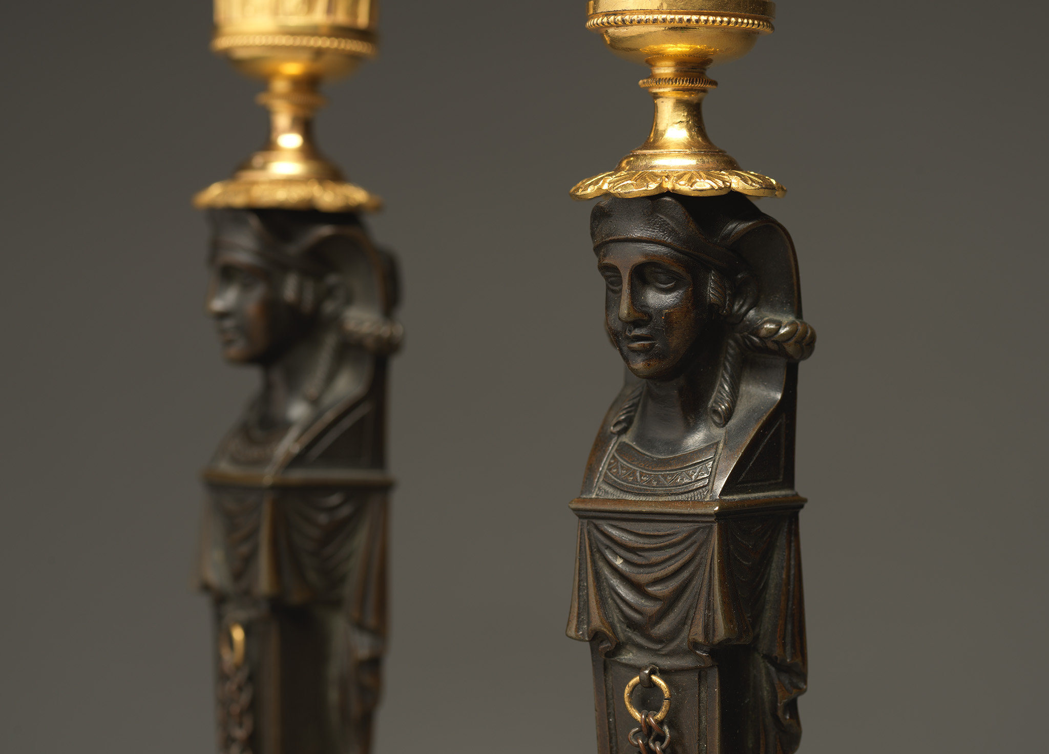 Each candlestick is surmounted by an Egyptian female figure supporting a finely chased, leaf-decorated candle nozzle. The circular bases are composed of Carrara and turquin bleu marble, enriched with finely cast and chased ormolu mounts.
