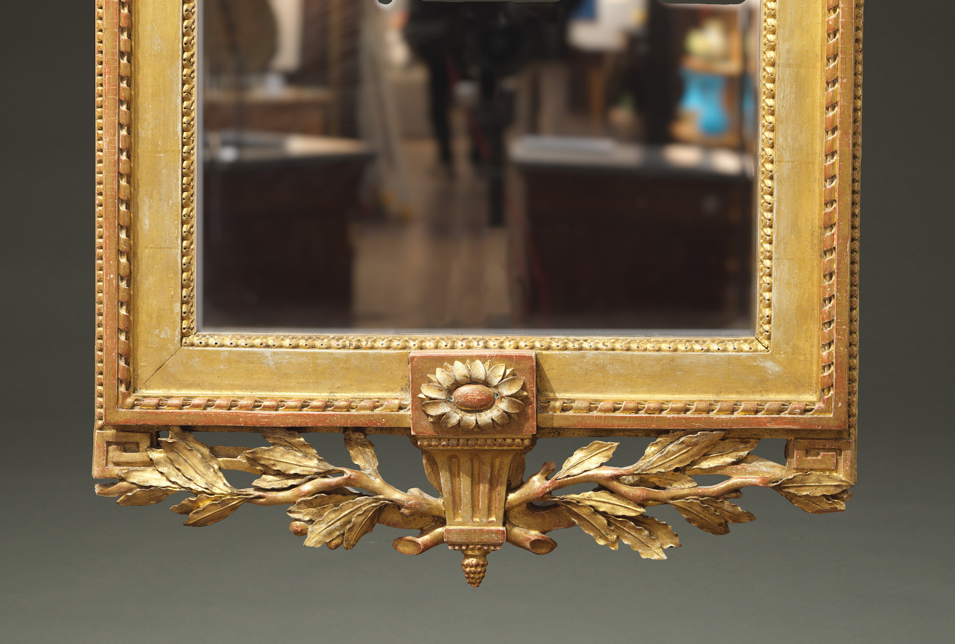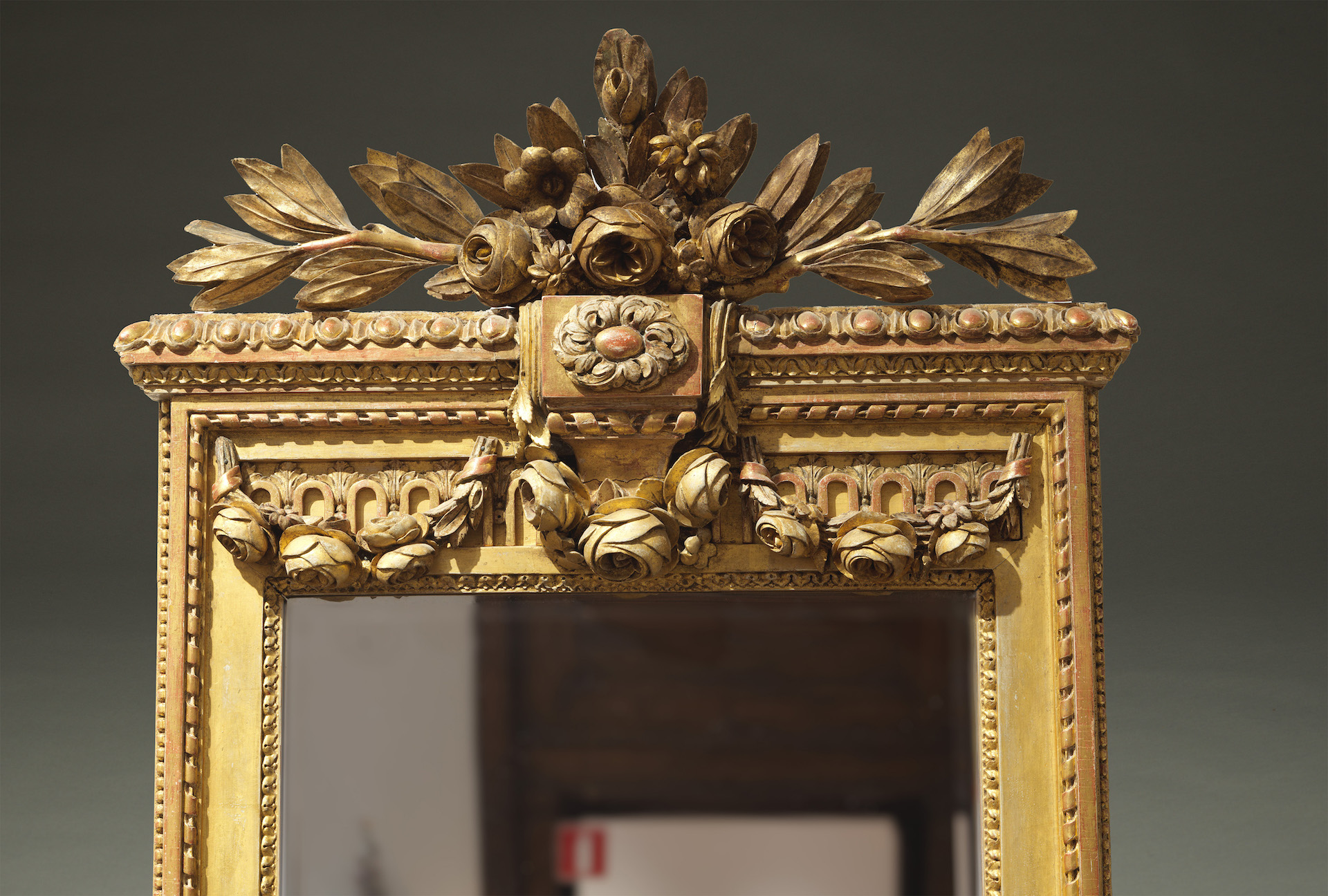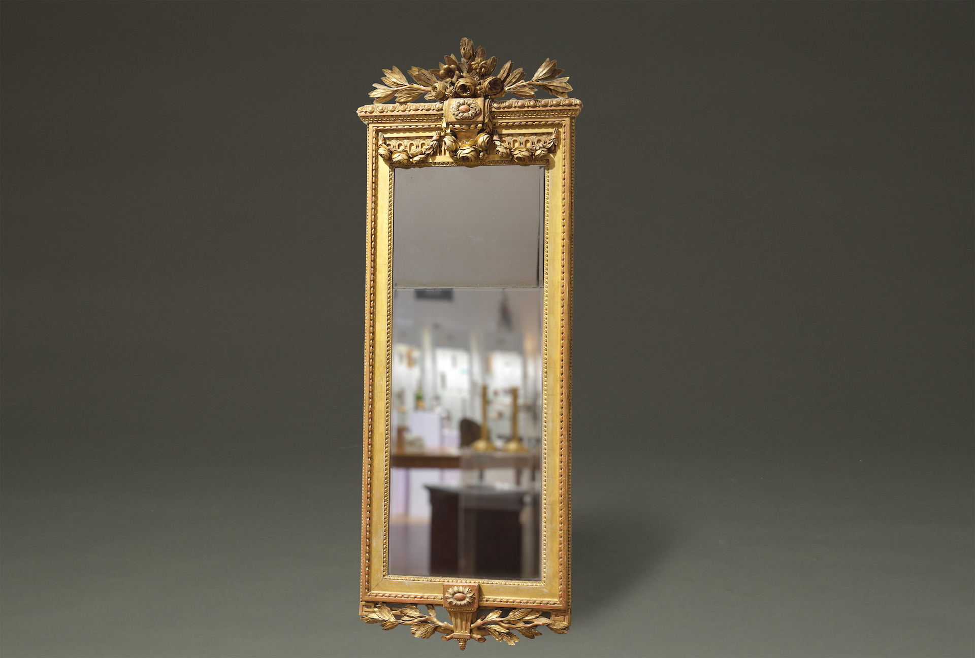 Utförd i snidat och förgyllt trä med vackert balanserade polerade och matta ytor. Krönet pryds av ett blomsterarrangemang, flankerat av lagerkvistar och eleganta blomsterfestonger. Längs ramens innerkant löper flera fint utformade gustavianska lister som omger det fasettslipade glaset. Den nedre delen är dekorativt utsmyckad med bl.a. lagerkvistar. Spegelns sniderier är av högsta kvalitet.